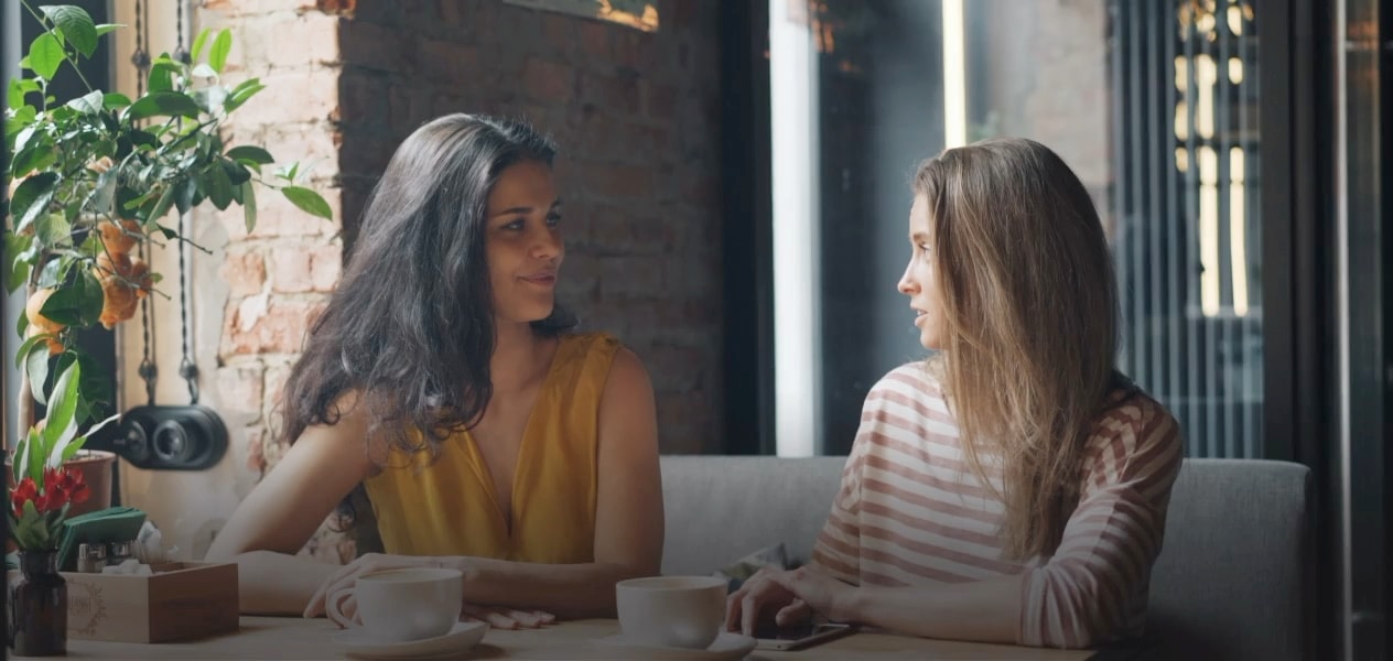 Eine Szene mit zwei Frauen, die sich in einem Restaurant unterhalten. Auf dem Bildschirm erscheint die Aufforderung Teste Untertitel in deiner Sprache. Klick auf die Schaltfläche Live-Übersetzung, und die Live-Übersetzung wird gestartet. Es erscheinen Untertitel für den Dialog der Frauen, der bis jetzt Bestes Essen lautet. Ich weiß, nicht wahr? Einfach so lecker. Wir sollten wiederkommen.