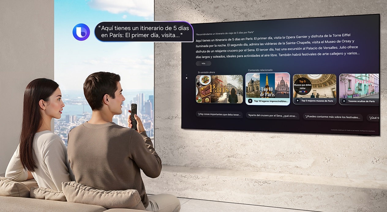 - Click to search: Función disponible solo en determinadas regiones y modelos. Función disponible en televisión terrestre, por cable y Samsung TV Plus. Tenga en cuenta que las fuentes y los canales disponibles pueden variar según la región. Los comandos de voz de Bixby reconocen inglés (EE. UU./Reino Unido), francés, español, alemán, italiano, chino y coreano. No se reconocen todos los acentos, dialectos y expresiones. Los detalles de los actores se proporcionan en función de los metadatos asociados al contenido que está viendo. Esta función proporciona contenido creado por IA. No se garantiza la precisión. Compruebe los resultados. Las imágenes de pantalla son simuladas con fines ilustrativos. Las imágenes se han generado con la ayuda de herramientas de IA.