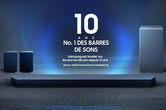 Une barre de son Samsung est accompagnée d'un caisson de basse et d'enceintes arrière. numéro 1 mondial des barres de son depuis 10 ans ,Samsung est la marque de barre de son la plus vendue depuis 10 ans. Années d'application 2014-2023. 2024 FutureSource Consulting Ltd Une barre de son Samsung est accompagnée d'un caisson de basse et d'enceintes arrière. numéro 1 mondial des barres de son depuis 10 ans ,Samsung est la marque de barre de son la plus vendue depuis 10 ans. Années d'application 2014-2023. 2024 FutureSource Consulting Ltd