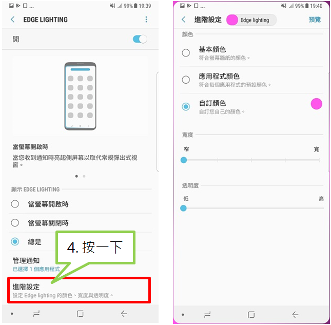 按一下 自訂顏色,並選擇您喜歡的顏色,若要調整Edge lighting的 寬度 和 透明度,請將調節棒左右移動,完成後,只需按 返回鍵 或 首頁鍵。