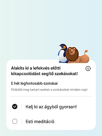 Mi az alvástréning?Az alvástréning egy olyan funkció, amely személyre szabott alvástanácsadási programot kínál az alvási adataid alapján. Viseld a Galaxy Watch-odat vagy Ringedet legalább 7 napig alvás közben, beleértve legalább 1 munkanapot és 1 pihenőnapot. Miután a rendszer elegendő adatot gyűjtött össze, kapsz egy alvási állatot, és elindul a program.