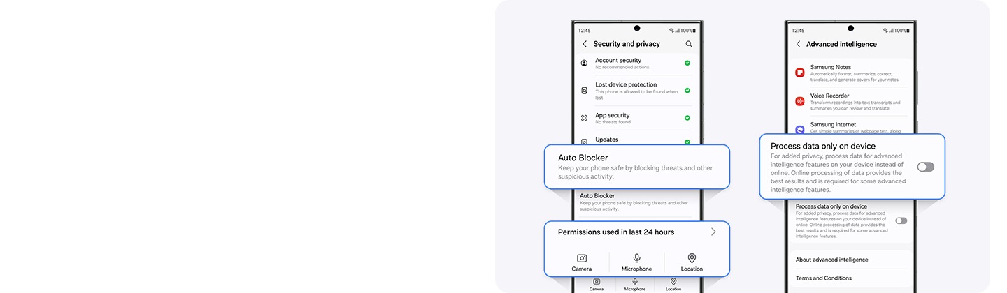 In Security and Privacy, get an at-a-glance view of the apps trying to access your information, then personalize your settings. And with Advanced Intelligence, you can choose to process data for AI services not only online, but also on your Galaxy device.