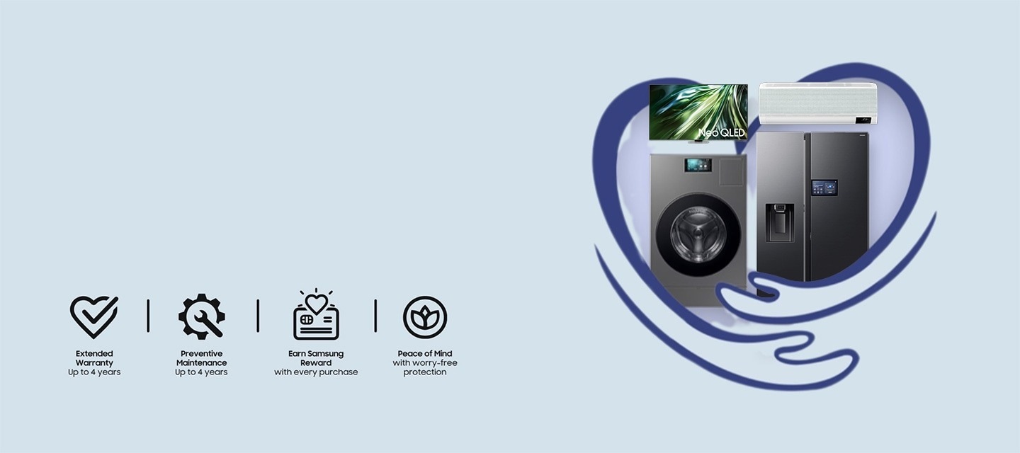 Get even more protection for your appliances! Get Samsung Care+ and enjoy peace of mind for as low as RM7.40 /month. Up to 5 years* warranty coverage!