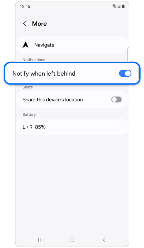 If you turn on Notify when left behind from Samsung Find or SmartThings Find, you can receive notifications when a Galaxy device connected to your phone is disconnected.
