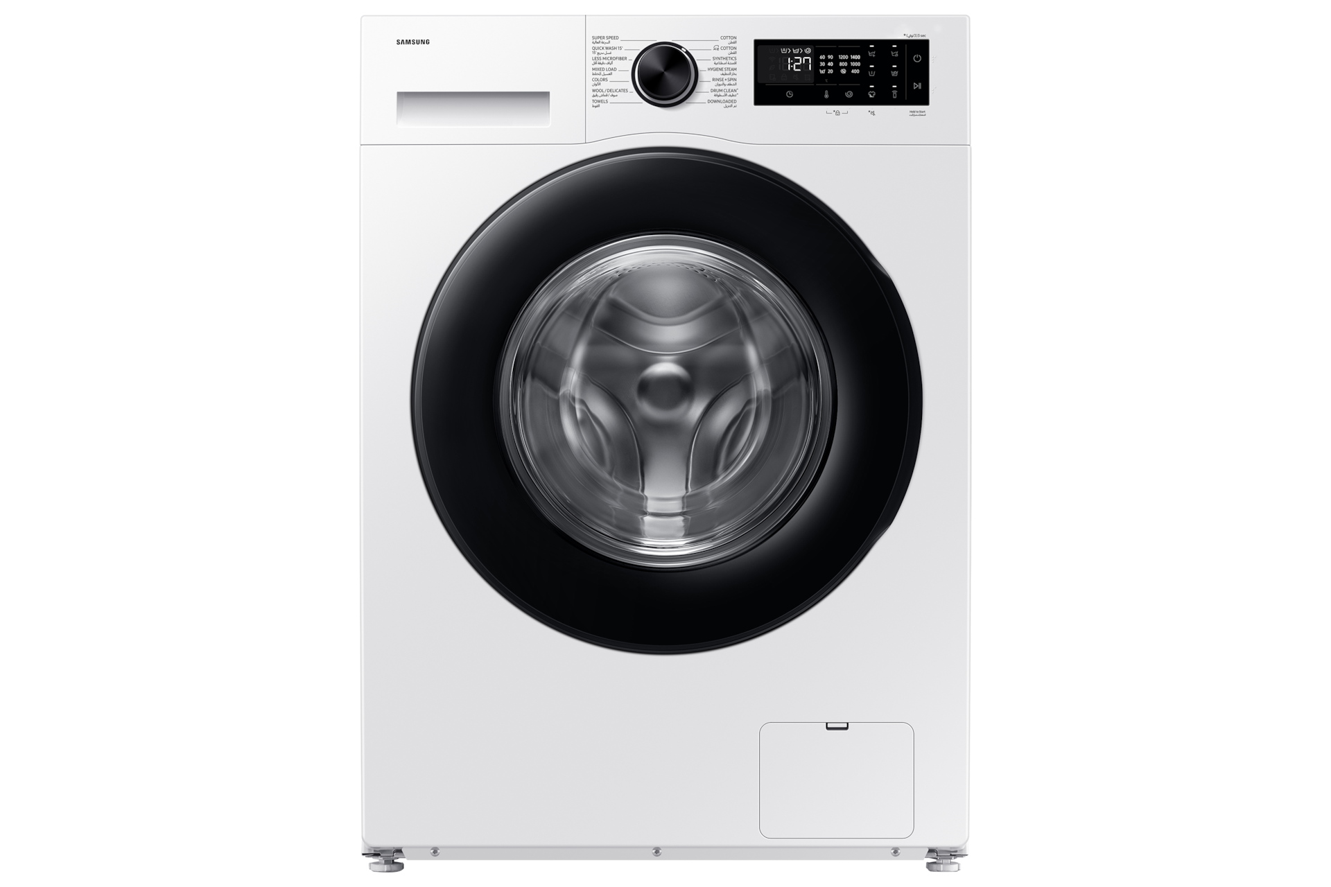 **** استناداً إلى اختبار EMPA على الطراز بوزن 9 كجم (الطراز WF906U4SAGD، الملابس المصنوعة من الألياف الصناعية)، باستخدام تكنولوجيا ™Ecobubble أو من دونها. تم جمع كل البيانات من اختبارات فردية. قد تتغير النتائج الفعلية حسب الاستخدام الفردي.