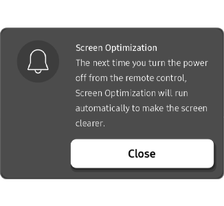 Connect the product to a power source, then turn off the TV with the remote control and turn it on again after 10 to 15 minutes. When the power is turned on, a pop-up will appear, indicating that Screen Optimization is complete.