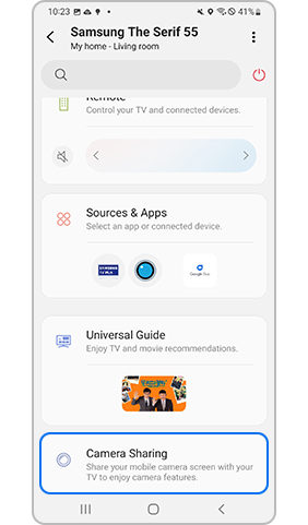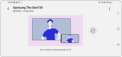 Step 1. When you activate TV apps that need a camera connection (e.g. Google Duo, Smart Trainer, Multi View, etc.), a camera connection notification will appear on your TV and smartphone. Select the Mobile Camera button.