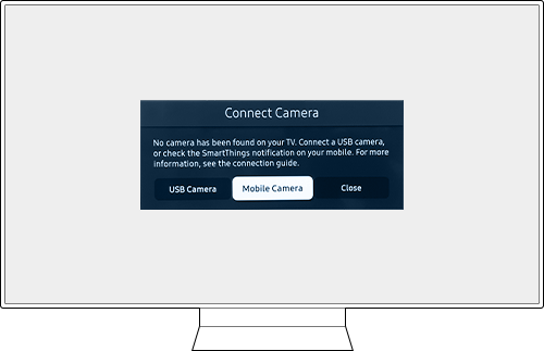 Step 1. When you activate TV apps that need a camera connection (e.g. Google Duo, Smart Trainer, Multi View, etc.), a camera connection notification will appear on your TV. Select the Mobile Camera button.