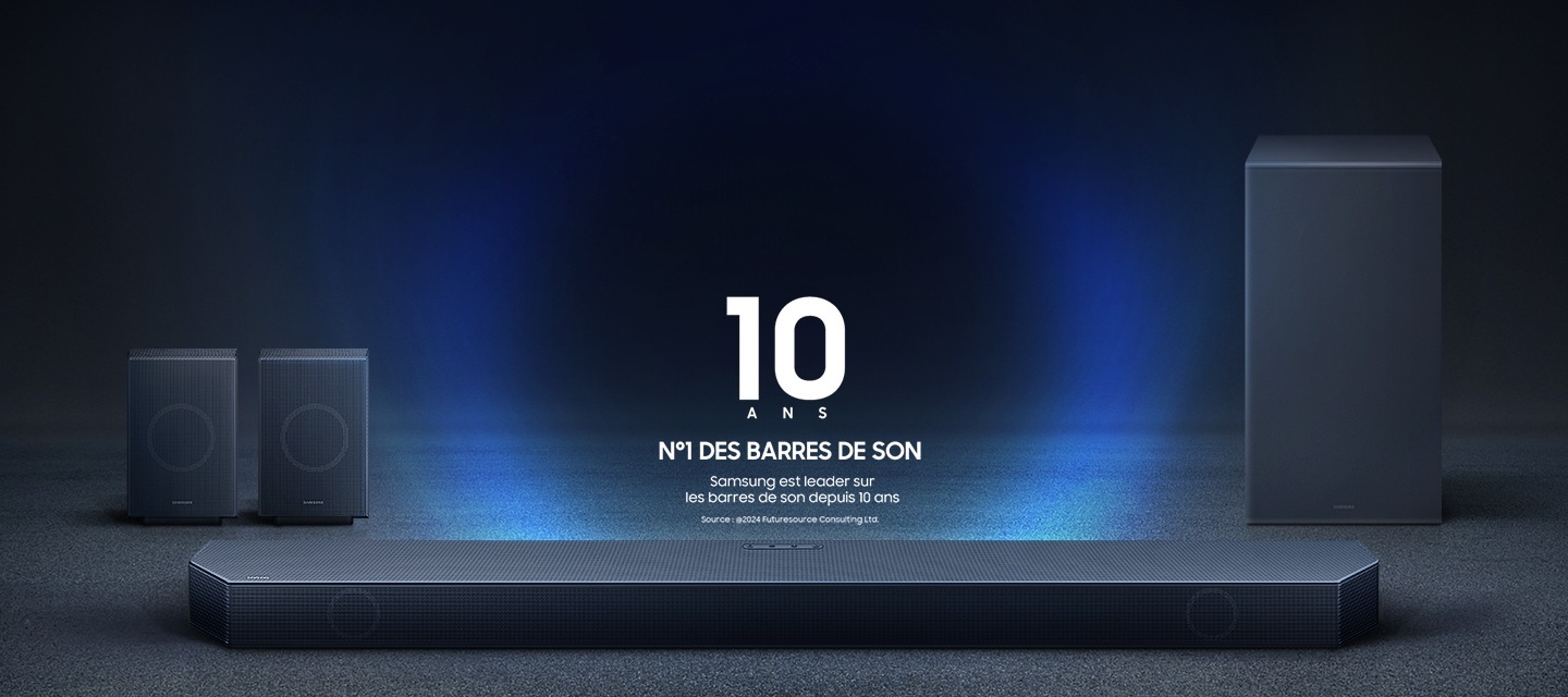 *La technologie Q-Symphony est compatible avec les téléviseurs Samsung QLED et Neo QLED (à partir des modèles 2021), OLED (à partir des modèles 2022) et The Frame (à partir des modèles 2022). Elle nécessite une connexion HDMI, optique ou Wi-Fi au téléviseur.
