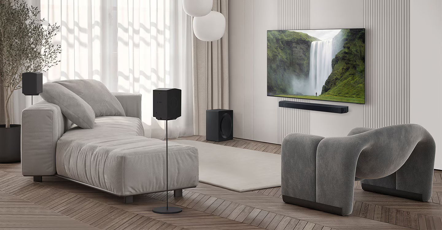 Une barre de son équipée de haut-parleurs arrières offrant une expérience cinématographique immersive chez vous.