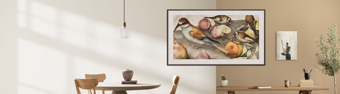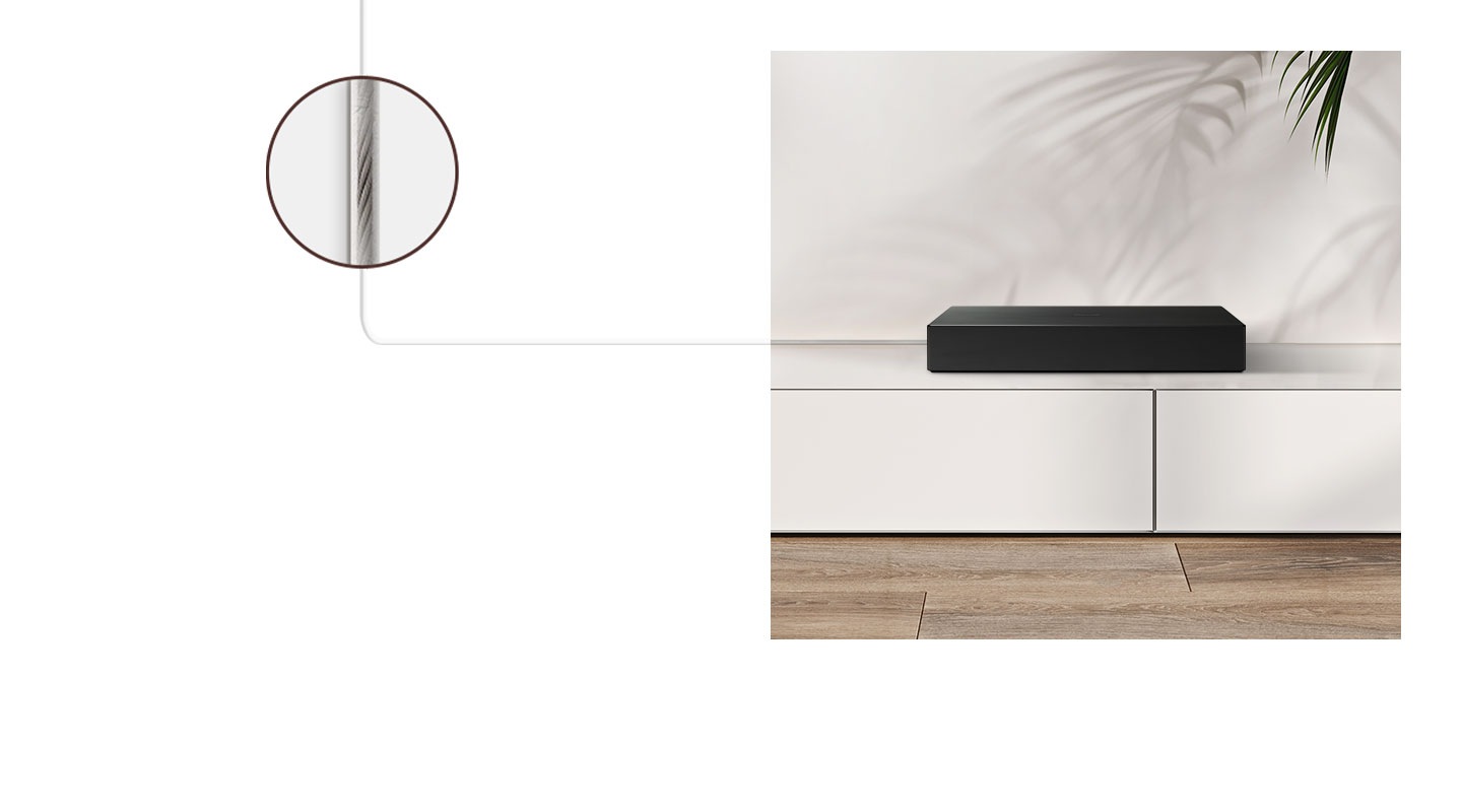 Un seul câble connecte The Frame au boîtier One Connect, placé sur un meuble télé.