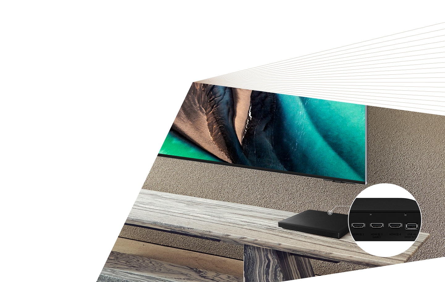 Évitez l’encombrement grâce à un boîtier One Connect à fixer encore plus fin. Il est facile de la ranger à l’arrière de votre téléviseur ou de le placer soigneusement sur le côté.