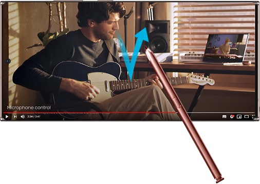 - Para aumentar e diminuir o volume enquanto toca música: Levante ou baixe a Caneta S enquanto prime e segura o botão da Caneta S.