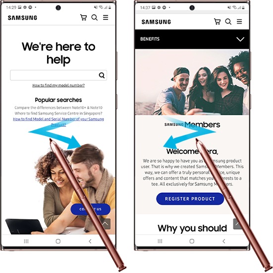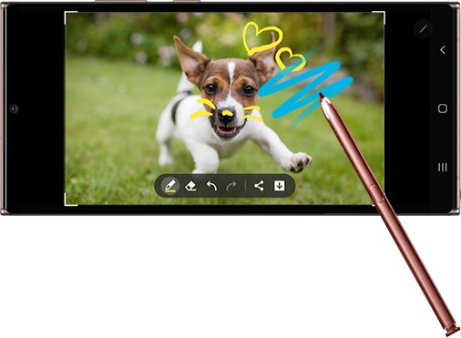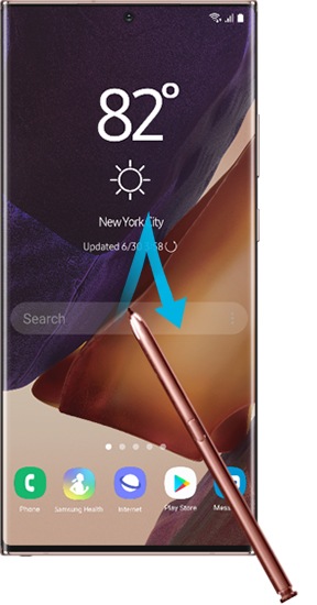 A Caneta S do Galaxy Note20 e Note20 Ultra foi reestruturada para corresponder aos seus movimentos, permitindo-lhe controlar o seu telemóvel através de gestos simples. Anteriormente, a série Galaxy Note10 tinha 6 gestos (esquerda/direita, cima/baixo, balanço esquerda/direita) para controlar o dispositivo. A Caneta S do Galaxy Note20 e Note20 Ultra adiciona mais cinco novas ações de gestos que funcionam em qualquer lugar, independentemente das aplicações que esteja a executar.