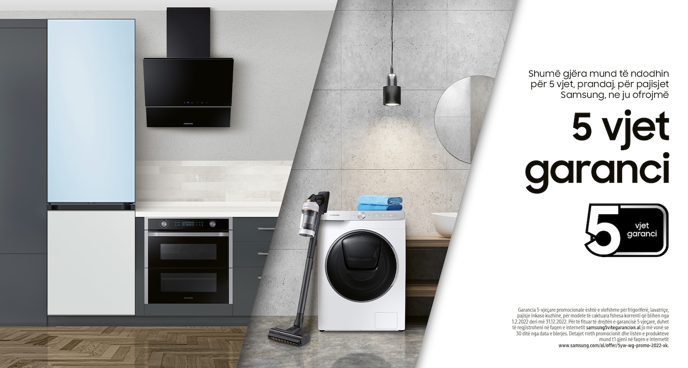 Duke qenë se e dimë se për 5 vjet mund të ndodhin shumë gjëra, ju ofrojmë 5 vjet garanci për disa modele të caktuara të frigoriferëve, lavatriçeve, pajisjeve inkaso të kuzhinës dhe fshesave me korrent Samsung të blera në periudhën nga 1/2/2022 deri më 31/12/2022.