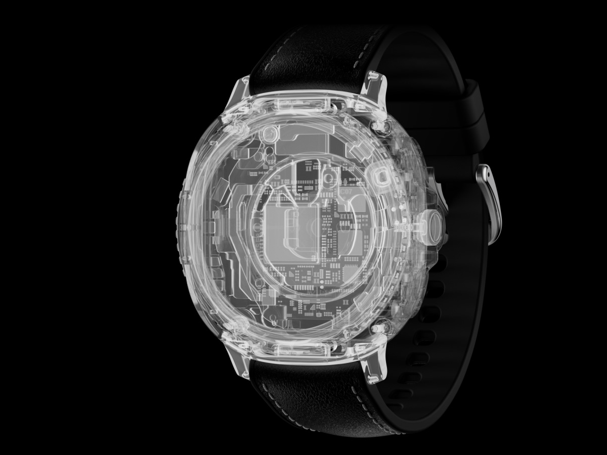 Shfaqet një formë katrore me qoshe të rrumbullakosura. Katrori shndërrohet në Galaxy Watch8 Classic. Silueta mund të shihet. Shfaqet një pamje skeletore e brendshme. Pajisja anohet pak në të majtë.