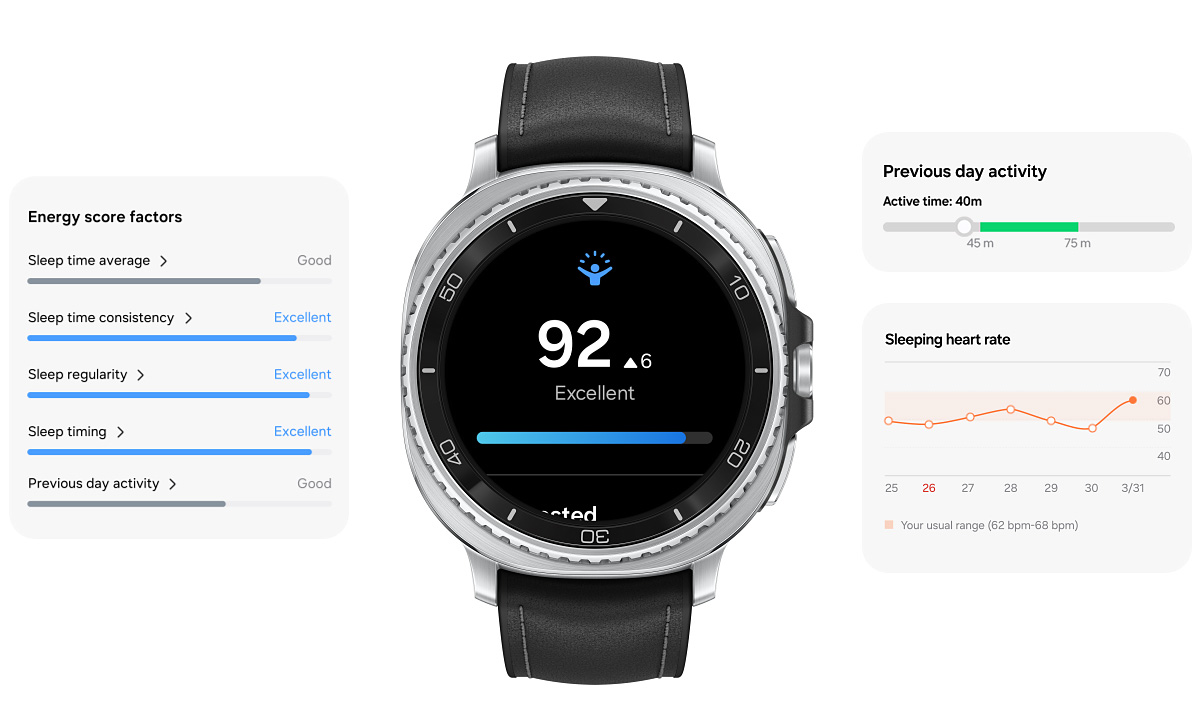 Galaxy Watch8 Classic me Rezultatin e energjisë në ekran. Rezultati i energjisë fillon nga 60 dhe rritet në 92, së bashku me shiritin e progresit më poshtë. Rezultati i energjisë për sot është 6 pikë më i lartë se dje dhe niveli i Rezultatit të energjisë është I shkëlqyer. Shfaqen tre GUI të Rezultatit të energjisë. Njëri është faktori i Rezultatit të energjisë, secili me nivelin e tij. Mesatarja e kohës së gjumit është E mirë, konsistenca e kohës së gjumit është E shkëlqyer, Rregullsia e gjumit është E shkëlqyer, Koha e gjumit është E shkëlqyer, Aktiviteti i ditës së mëparshme është I mirë. GUI i dytë është aktiviteti i ditës së mëparshme, që tregon kohën aktive 40 minuta dhe grafikun përkatës. GUI i tretë është për rrahjet e zemrës në gjumë me një grafik që nxjerr në pah diapazonin e zakonshëm të përdoruesit nga 62 bpm në 68 bpm së bashku me rrahjet e zemrës së përdoruesit gjatë gjumit.