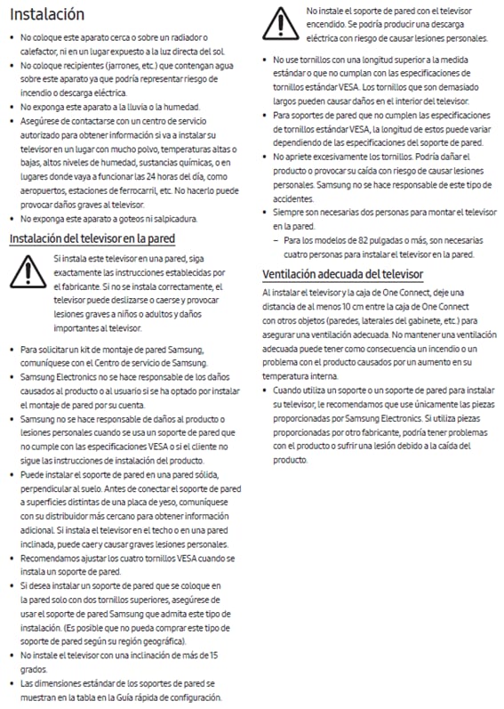 Al instalar el televisor, se debe dejar una distancia de al menos 4 pulgadas (10 cm) entre el televisor y otros objetos (paredes, laterales del gabinete, etc.) para asegurar una ventilación adecuada. No mantener una ventilación adecuada puede tener como consecuencia un incendio o un problema con el producto causados por un aumento en su temperatura interna.