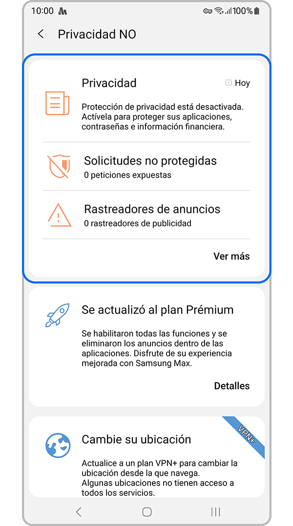 Samsung Max en su versión Premium/VPN+ ofrece funciones mejoradas y adicionales en comparación con el plan básico. Este plan está diseñado para usuarios que buscan un mayor control sobre su seguridad, privacidad y uso de datos.