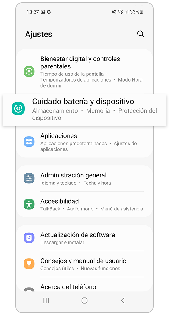 ➊ Andá a “Ajustes” y seleccioná “Cuidado batería y dispositivo”.
