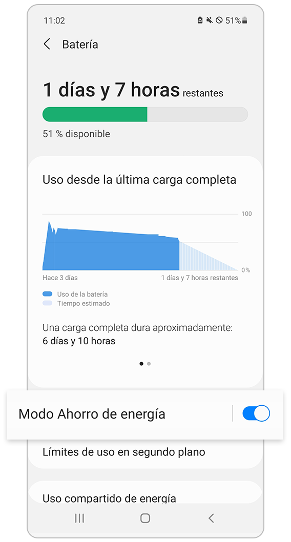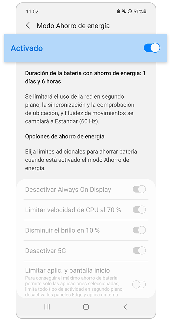 • El “Modo Ahorro de energía” limita el uso de la red, la sincronización de datos, la información de la ubicación en segundo plano.