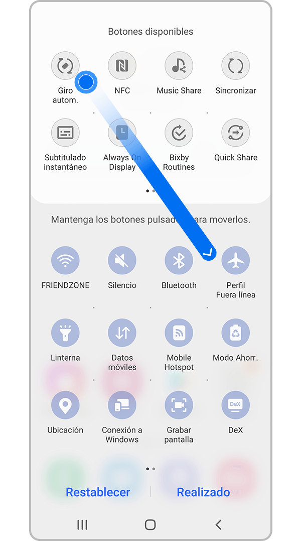 Cuando tocás el ícono azul de Rotación automática activo, el ícono cambiará a un modo horizontal o vertical gris y la pantalla permanecerá así (hacia arriba o hacia los lados).