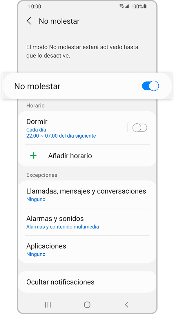 El modo No molestar configura el teléfono para silenciar todos los sonidos, excepto las excepciones que preestableciste. También podés configurarlo para que se encienda o apague automáticamente en horarios programados, para que no te pierdas una llamada importante. Cuando necesites un descanso tranquilo, seguí los pasos a continuación para activar la función No molestar.