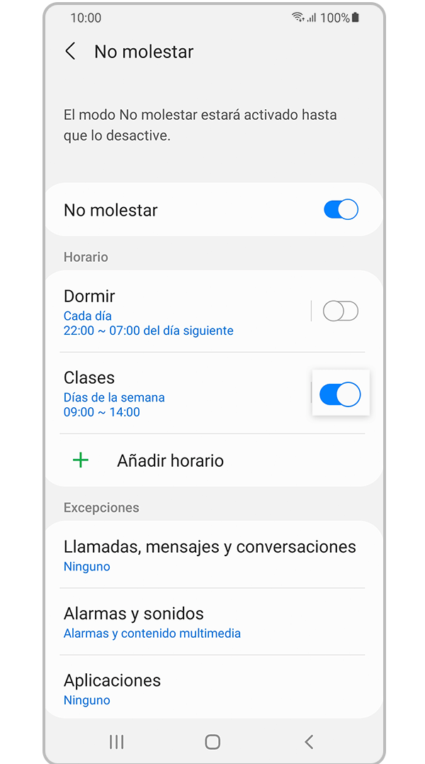 Podés evitar que las alertas de tu teléfono te molesten cuando tienes clases regulares o cuando duermes todos los días. Seguí los pasos a continuación para configurar un horario para activar automáticamente No molestar.