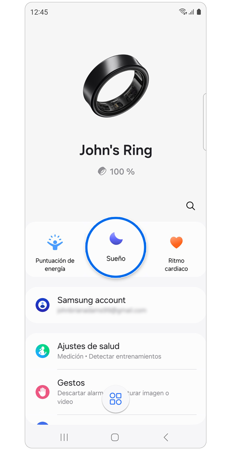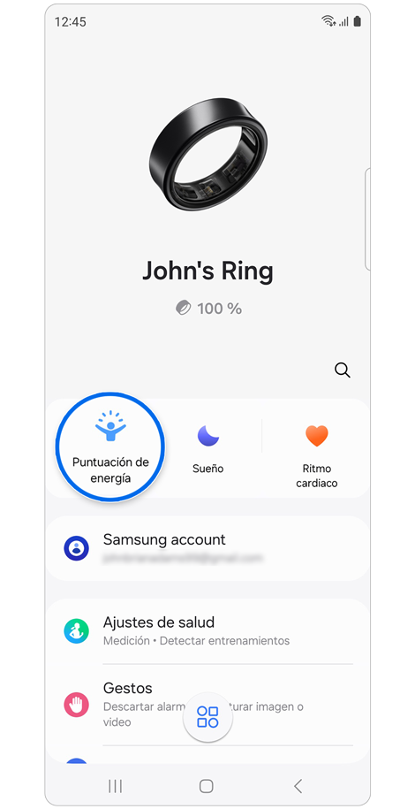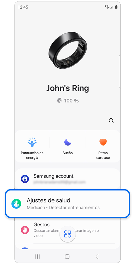 Podés verificar el estado del Anillo, como el estado de la conexión o el nivel de batería restante, y los datos de salud medidos usando la aplicación Galaxy Wearable.