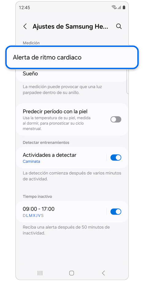 * Si tu Galaxy Ring está conectado a tu teléfono, podés verificar el nivel de batería restante del Anillo en la aplicación Galaxy Wearable.