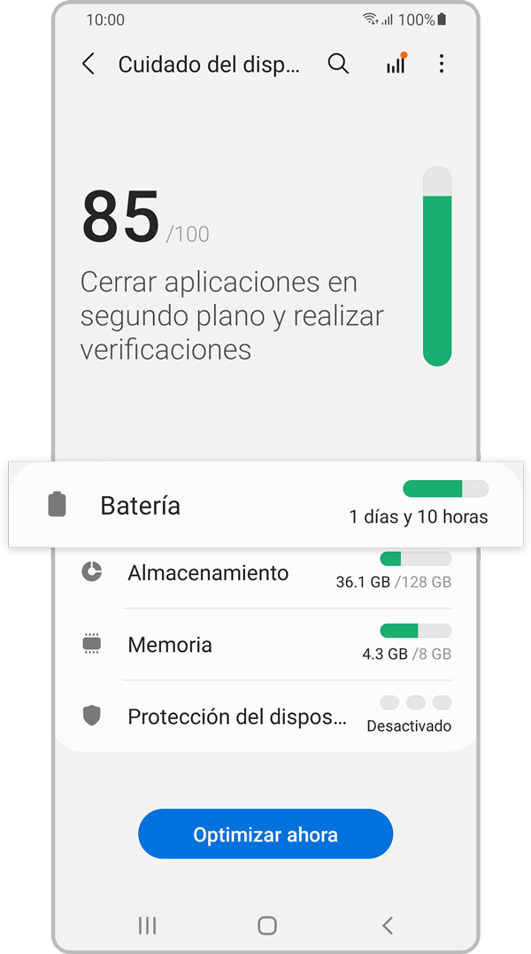 Podés comprobar la carga restante de la batería y el tiempo de uso del dispositivo. También podés controlar de cerca la cantidad de batería que usan tus aplicaciones.