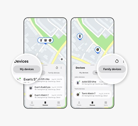 - Die Familienstandorte für Geräte sind nur innerhalb von Samsung-Account-Familiengruppen verfügbar. Um eine Familiengruppe einzurichten, gehe zu Geräteeinstellungen > Samsung Account > Familie.