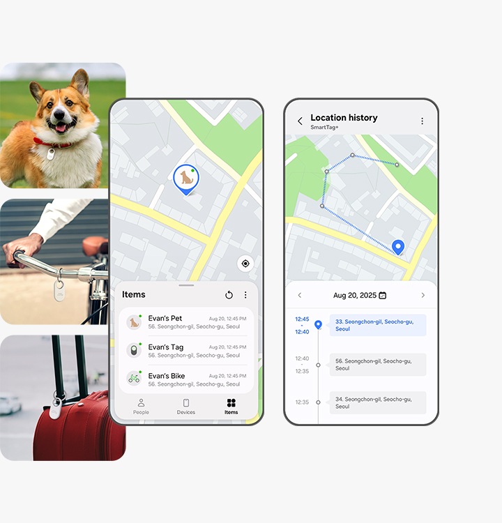 Entdecke SmartTags und andere kompatible Tracker, die in SmartThings registriert und über den Tab „Gegenstände“ in der Samsung Find App zugänglich sind. Registriere SmartTags direkt in der App und verfolge nicht nur persönliche Gegenstände, sondern auch geliebte Haustiere, Fahrräder und vieles mehr.