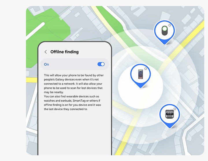 Erhalte eine Benachrichtigung, wenn dein Gerät erkannt wird, selbst wenn es offline ist. Das Galaxy Find Netzwerk hilft dir, dein verlorenes Gerät mithilfe von Nearby Galaxy Geräten zu finden. Deine Privatsphäre bleibt geschützt, denn dein Gerät bleibt anonym und die Daten sind verschlüsselt.4,5,6