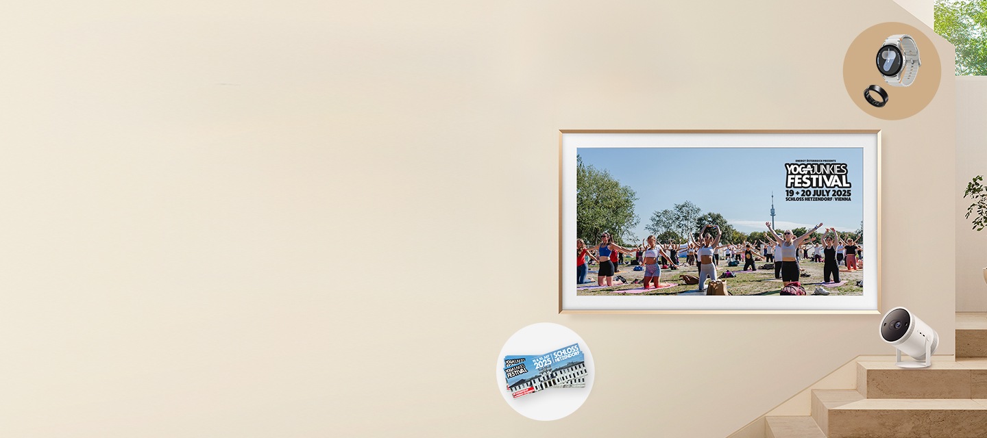 * Aktion gilt ausschließlich für Verbraucher iSd KSchG im Aktionszeitraum vom 02.06.2025 bis 15.07.2025 23:59 beim Erwerb eines The Freestyle (2023), The Frame TV 32 Zoll (2023), alle The Frame TVs Modelle (2024 und 2025), Galaxy Watch6, Galaxy Watch7 (44mm BT, 40mm BT, 44mm LTE, 40mm LTE), Galaxy Watch6 Classic, Galaxy Watch7 Classic (47mm BT, 43mm BT, 47mm LTE, 43mm LTE), Galaxy Watch Ultra (47mm LTE), Galaxy Ring im teilnehmenden Handel. Voraussetzung für den Erhalt des individuellen Gutscheins für die Tickets ist die fristgerechte Registrierung auf yogajunkies.samsung.at bis 15.07.2025 23:59. Die Gutscheine für die Tickets können bis bis spätestens 20.07.2025 unter https://www.yogajunkies.com/en/pages/festival eingelöst werden. Kein Umtausch oder Barablöse möglich. Solange der Vorrat reicht. Es gelten die vollständigen Teilnahmebedingungen.