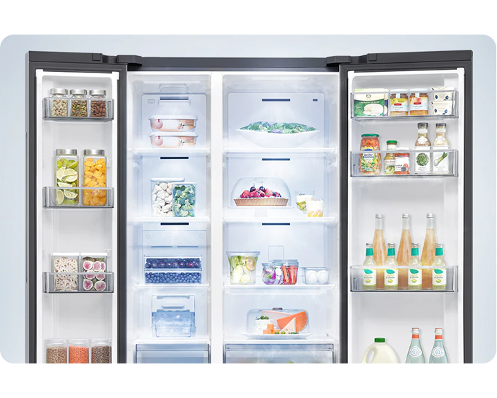 Die Rundum-Kühlung verteilt kalte Luft gleichmäßig im Kühlschrank. Dadurch bleiben die Lebensmittel kühl, unabhängig davon, wo sie im Kühlschrank gelagert sind.