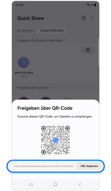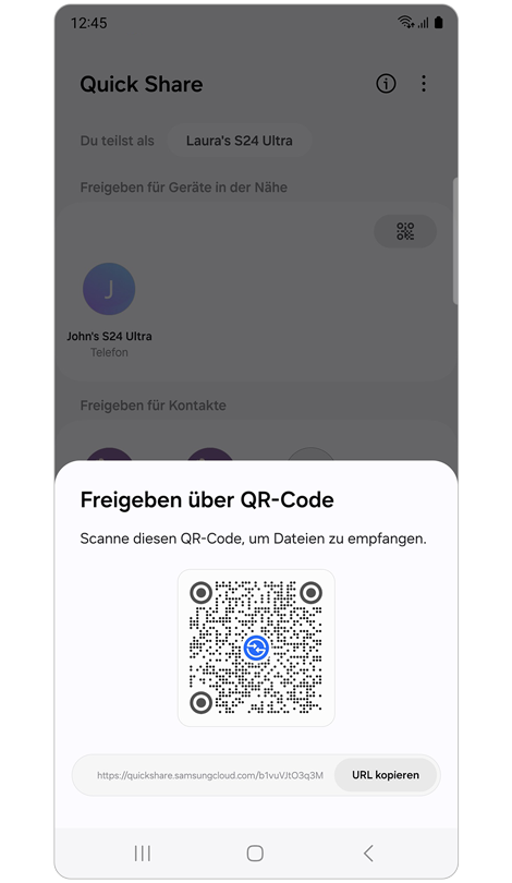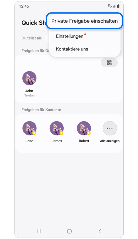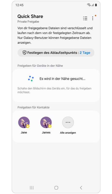 Quick Share bietet den Nutzern von Galaxy Geräten drei Optionen für die Dateifreigabe: Freigeben für Geräte in der Nähe, QR-Code oder Freigeben für Kontakte. Du kannst auch Private Freigabe aktivieren, um zu verhindern, dass andere Personen von freigegebenen Dateien einen Screenshot machen oder freigegebene Dateien speichern oder erneut versenden.