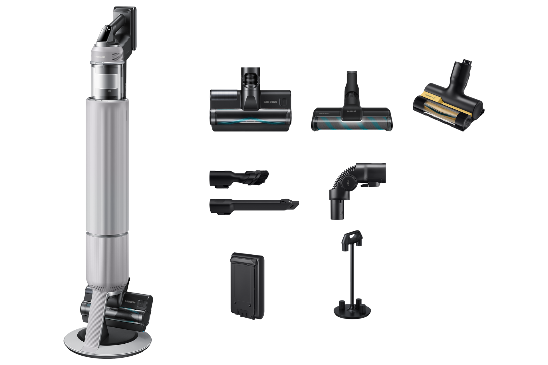 * Verglichen mit dem Samsung VS9700. Handgeführtes Gewicht: Bespoke AI Jet Lite = 1,45 kg vs. VS9700 = 1,89 kg. Bespoke AI Jet Lite mit Slim LED-Bürste+ = 2,49 kg und Bespoke AI Jet Lite mit Jet Dual-Bürste+ = 2,7 kg vs. VS9700 = 3,17 kg mit Bürste für Bodenreinigung.
