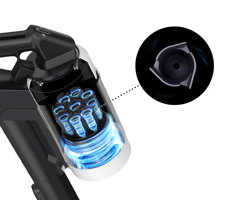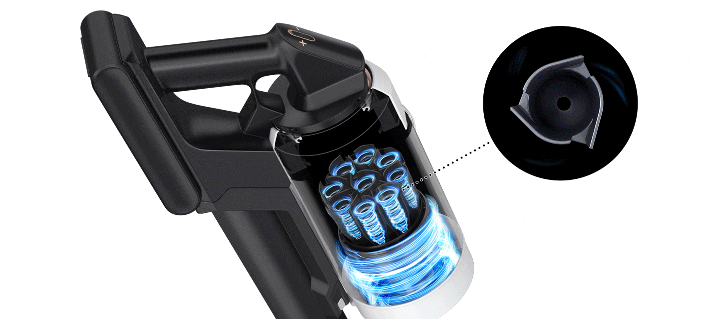 Genieße saubere Luft und eine starke Saugleistung mit der hocheffizienten Multi-Cyclone Technologie des Jet Cyclone-Systems. Die 9 Zyklone mit 27 Lufteinlässen sorgen für einen optimierten Luftstrom, trennen diesen effektiv von Staub und Schmutz, und sorgen somit für lang anhaltende Saugkraft.