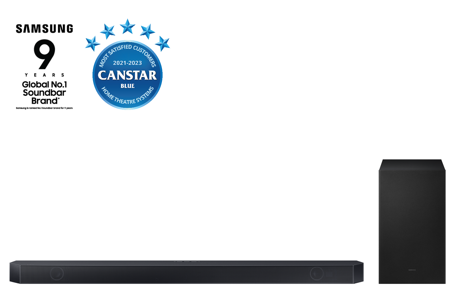 1 Source content must be Dolby Atmos® or DTS:X enabled for Dolby ATMOS® or DTS:X playback. Samsung define "True Dolby Atmos" as featuring an upwards-firing directional speaker for three dimensional sound. Wireless Dolby Atmos transmission via Wi-Fi works with 2022-2023 Samsung TVs. Mains power connection required.