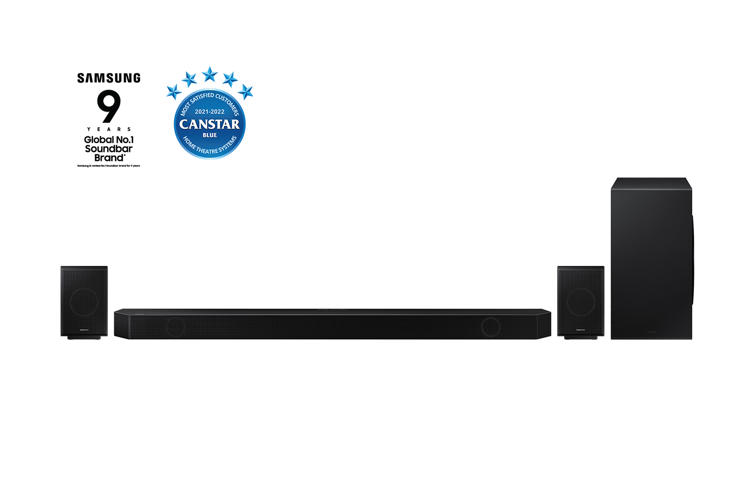 Sensational sound can be yours with the 11.1.4-channel Q-Series Home Theatre Soundbar Q990B, with World First Wireless True Dolby ATMOS & DTS:X connection.* The perfect match for Samsung Neo QLED TV with Total Sound Collaboration+ and included Rear Speakers synchronising sound to your room and compatible TV.