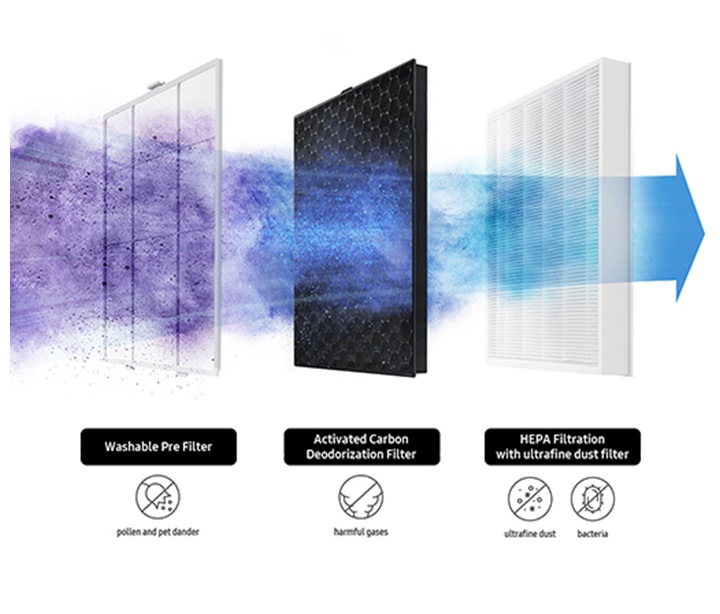 HOW DO SAMSUNG AIR PURIFIERS WORK? (I.E. WHAT IS MULTILAYERED PURIFICATION SYSTEM)Samsung Air Purifiers contain an advanced filter system that helps capture ultra-fine dust from the air. The multi-purification system has three key steps: