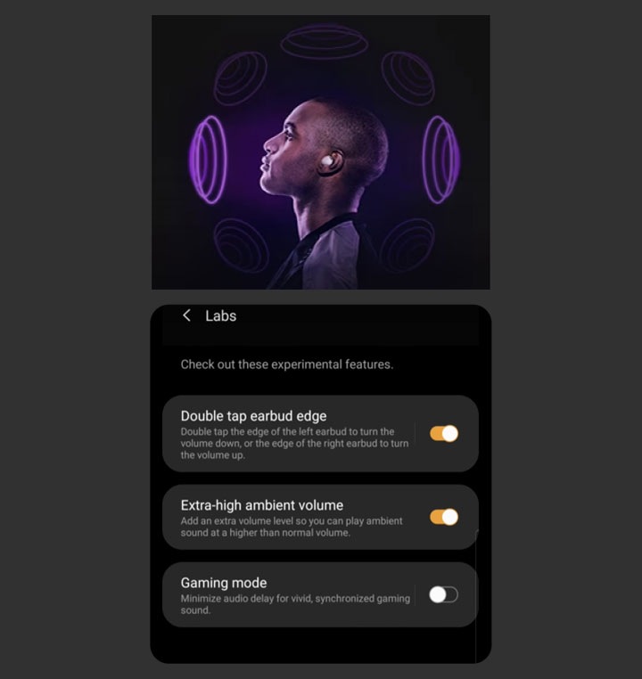 1 Gaming mode is only available on Samsung phones that are connected to the Galaxy Buds+, Galaxy Buds Live, Galaxy Buds Pro, Galaxy Buds2, and Galaxy Buds2 Pro through the Galaxy Wearable app. It is not available on iOS or the regular Galaxy Buds.
