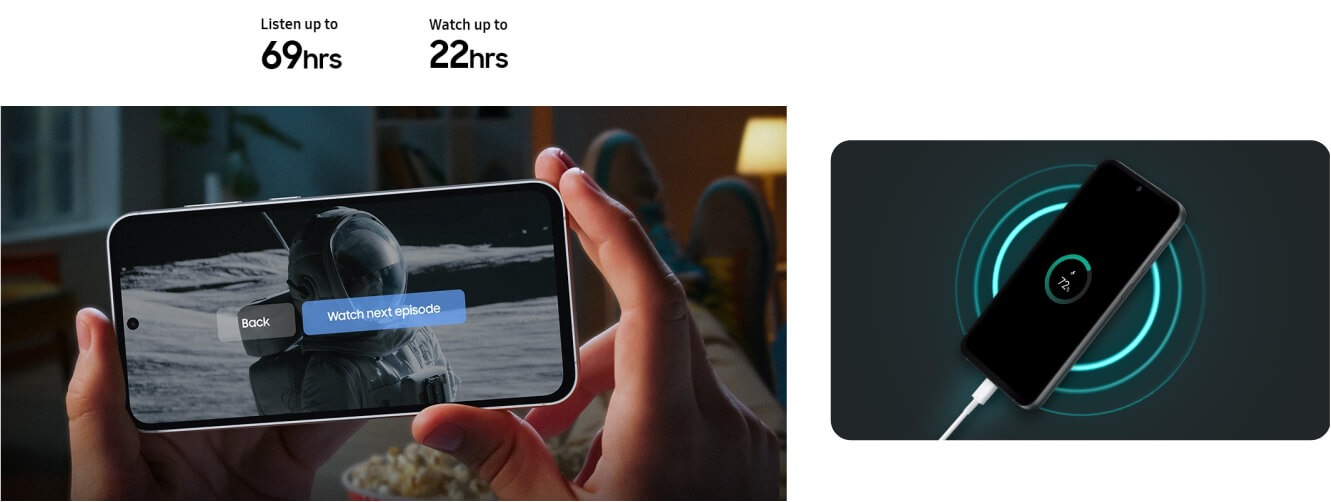 With a 4,500 mAh (typical) battery4, the Galaxy S23 FE ensures that your day is not disrupted by long charging sessions or, worse, a flat battery. The long-lasting battery on the device lets you watch up to 22 hours, or listen to music for up to 69 hours5 – so go ahead and game, or watch your favourite shows all night long! But just in case you’ll need to add some juice to your device, don’t worry, because the 25W Wall Charger6 supports Super Fast Charging, charging up to 50% in just 30 minutes.