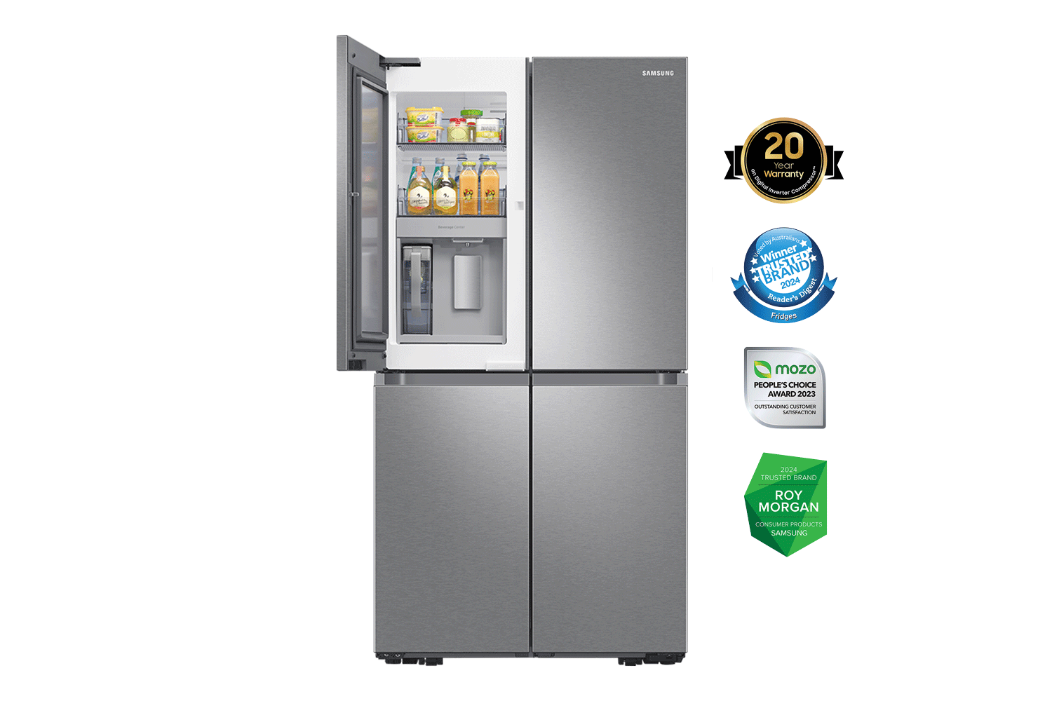 Finished in modern black, the French Door Refrigerator SRF7500SB with 648L capacity handles the needs of even the largest households. Its clever door-in-door design allows quick access to the convenient Beverage Centre, and a 20-year digital inverter compressor warranty⁶ promises reliable long-term use.