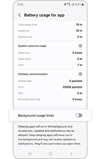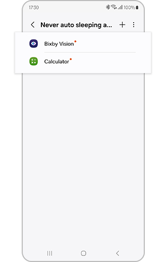※ Apps added to 'Never auto sleeping apps' do not automatically go to sleep/deep sleep and may cause additional battery usage in the background.