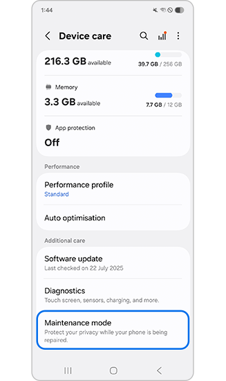 - You can also exit Maintenance mode by going to Settings > Device care > Maintenance mode.
