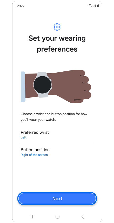 Step 1. Turn on the Galaxy Watch and select a language by scrolling through the options. You will be able to choose your language based on your country or region.