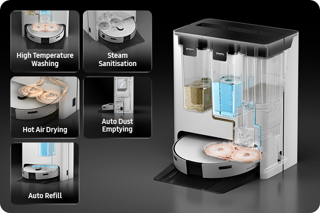 10 A stained area is defined as a solid, colored and opaque spot, such as a dried juice, with a size of 4cm x 4cm or larger. Stained area identification may be affected by the size of the stain or the environmental conditions of the floor, such as the floor pattern. A Wi-Fi connection and Samsung account are required.