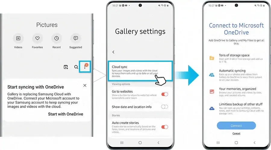 Serija Galaxy Android 10 ili novija podržava integraciju s OneDriveom, što korisnicima omogućava da sinkroniziraju fotografije i video zapise s OneDriveom izravno iz aplikacije Galerija. Ako uređaj ispunjava potrebne zahtjeve, možete ići na Galaxy postavke i povezati svoj OneDrive račun kako biste ga koristili kao mjesto za pohranu sigurnosnih kopija. Nadalje, sve postojeće fotografije i video zapisi sa Samsung Clouda mogu se prenijeti na OneDrive.